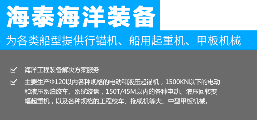 江蘇海泰海洋裝備有限公司位于素稱“銀杏之鄉(xiāng)”的泰興市,2018年投資建設(shè),至今已經(jīng)成為產(chǎn)品研發(fā)、生產(chǎn)制造,調(diào)試服務(wù)為一體的設(shè)備配套企業(yè)。公司從事海洋裝備(設(shè)備)及配件的制造、設(shè)計、安裝,維修;船用錨機、絞車、起重機、舾裝件、電氣設(shè)備、環(huán)保設(shè)備設(shè)計、制造。公司成立以來,就與中國船舶工業(yè)集團公司第701所、702所、704所、708所、上海船舶研究設(shè)計院等多家船舶科研院所建立了技術(shù)合作關(guān)系,產(chǎn)品應用于......